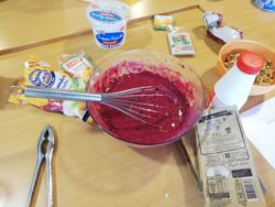 Autour de la table on épluche et on coupe dans une ambiance chaleureuse, les discussions vont bon train et chacun échange ses petites astuces de cuisine. Les ingrédients proviennent pour la majorité d’une AMAP, celle de la ferme des Pibouls qui dépose des paniers chaque semaine dans le centre social. Le repas du jour est 100% bio et local, exception faite pour les baies de goji et graines de chia qui viennent agrémenter les entrées.