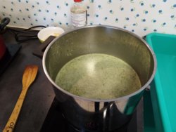 - préparation d'un bouillon de poulet maison au gingembre et à la sauce soja pour en faire une soupe de fanes de radis avec utilisation de pain rassit pour lier la soupe (recette zéro déchet : utilisation d'une carcasse de poulet, de fanes de légumes et de pain dur en remplacement des pommes de terre)