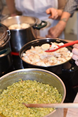 Chacune se concentre sur sa tâche, on lave, on épluche, on coupe, les odeurs de céleri et de panais emplissent toute la cuisine. Une journaliste de France Bleu s'est jointe aux participantes, elle recueille des témoignages et des impressions auprès des cuisinières. Lorsqu'elle interroge Yolande sur sa consommation depuis le début du défi, celle-ci confie ses progrès et ses difficultés : "En hiver c'est difficile de ne pas céder lorsqu'on voit tous les produits dans les magasins", elle avoue avoir acheté des tomates pour les fêtes. Marie la rassure, on se détache difficilement des vieilles habitudes, mais c'est aussi une bonne raison de faire des conserves de tomates durant l'été.