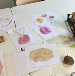 Pendant ce temps, les enfants profitent d'un atelier à la peinture végétale . Ils ont pu fabriquer et utiliser des peintures à base de légumes du jardin : chou, oignon, betterave rouge, épinards… A la fin de la matinée les plus jeunes ont pu exposer leurs œuvres devant le groupe et les familles ont pu faire leurs courses en légumes fraîchement cueillis pour leur repas du midi. Merci à tous les participants !