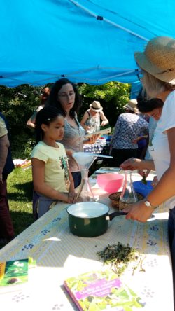 Et que serait un événement du défi sans un moment de partage de bonnes choses à boire et à manger ? Tartes sucrées, gâteaux au chocolat, crêpes d’orties, caramels au coquelicot, et roulés de plantain au fromage de chèvre étaient au menu, cuisinés par les familles, ainsi que des produits bio apportés par des producteurs.trices du voisinage : fraises, jus de raisin et lait de chèvres bien sûr !