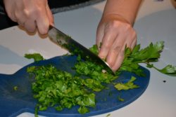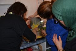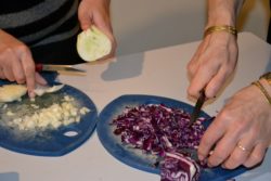 L'équipe s'organise en groupes pour préparer les différentes recettes : rincer, couper, touiller, hacher, faire revenir, assaisonner... la cuisine est en ébullition! Les légumes bios de Bruno et Menou et le reste des ingrédients venant du magasin bio, tout y passe ! Même les épluchures sont récupérées pour le refuge d'animaux sauvages et les poules.