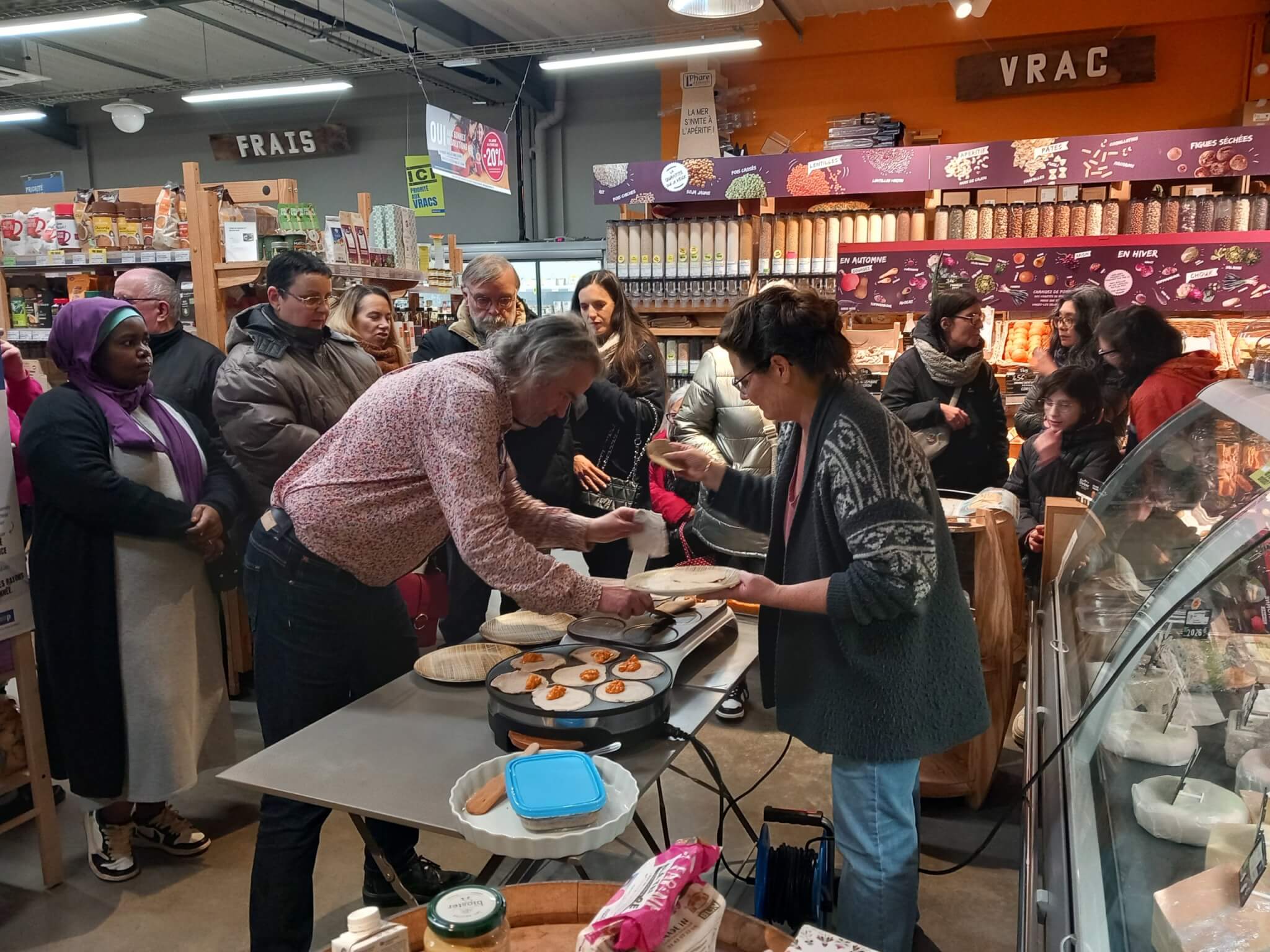 Ce fut l’occasion pour les foyers de découvrir les produits vracs proposés et les protéines végétales au travers de dégustations : crêpes, galettes au sarrasin, garnitures à base de seitan (protéines de blé), champignons, etc…