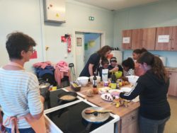 Pendant ce temps, les enfants mettent la main à la pâte lors d'un atelier cuisine bio. Au menu: pâté de châtaignes et champignons, pâté de riz au tofu fumé, petits pains aux algues, petits pains aux orties, rémoulade de céleri aux pommes, brochettes de fruits et pain d'épices aux 3 pommes. La soirée s'est achevée sur une note conviviale par une auberge espagnole composée de produits bio préparés par les participants.